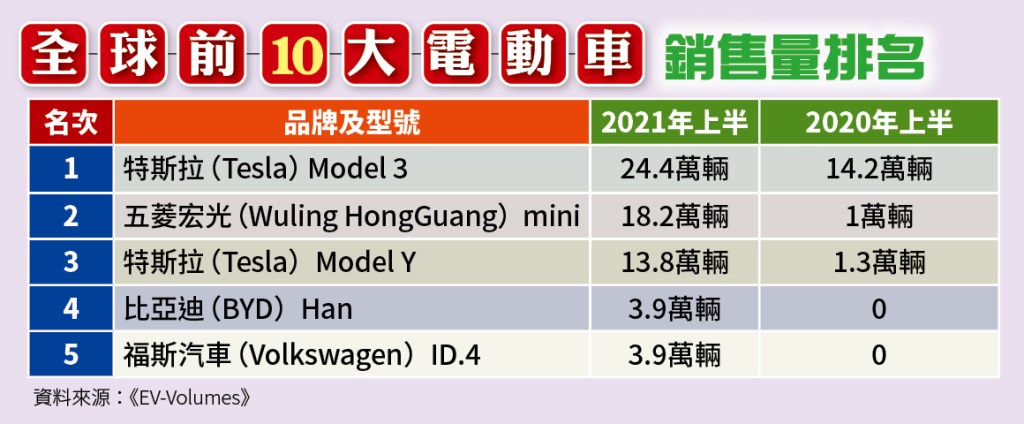 疫情爆發的二○二○年,全球汽車市場兩樣情,燃油車賣七千七百多萬輛,比前一年掉了一千多萬輛,電動車(EV)逆勢成長二○%賣出兩百四十萬輛。拓樸產業研究所指出,二○二一年電動車將成長四○%,賣出三百四十萬輛。媒體《EV-Volumes》則預估今年全球電動車(含電動卡車、巴士)銷量將達六百四十萬輛,年增九八%,幾乎翻倍。 勤業眾信聯合會計師事務所在〈二○二一汽車產業趨勢與展望〉報告分析,汽車市場一消一長,關鍵在於疫情衝擊了供需面,溫室排放與節能減碳議題發酵,加上不少國家端出補助政策,催促著電動車大躍進。電動車一哥特斯拉除了美國、上海外,另外在德國打造超級工廠,今年十月量產,汽車大廠豐田、賓士及福斯也跟進搶發電動新車。