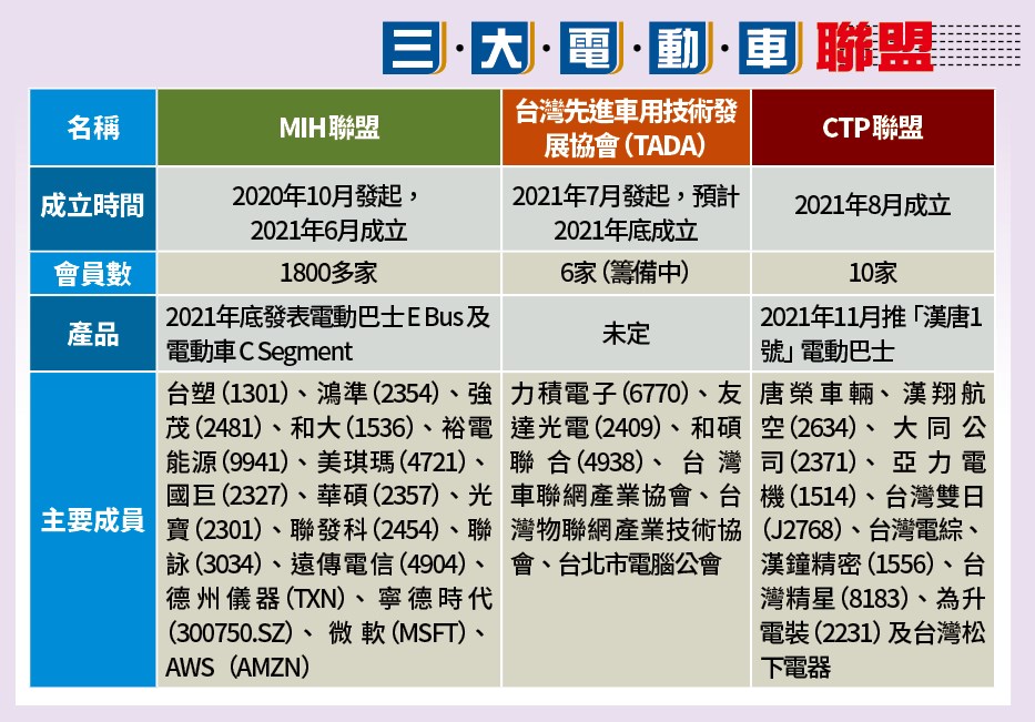 電動車商機究竟有多大?「電動車就是長了四個輪子的iPad。過去二十年你花多少錢買車跟買手機,就可以推測出這個產業的產值。」和碩聯合(4938)董事長童子賢日前在玉山科技協會座談上,一語道盡。 「一支智慧型手機售價四百~五百美元,一輛電動車售價四~五萬美元的,兩者產值差距就是百倍,二百萬輛電動車就等同於二億支智慧型手機的產值。」宏遠證券研究部副總陳國清舉例。除了輪胎、車殼及機械外,一輛電動車耗掉的半導體或被動元件消耗材料,是手機二○~三○倍,若以全球汽車年銷七千多萬輛計算,電子耗材約當十五億支手機量。 電動車產業成了嶄新的競技場,意外加速了台灣科技業與傳統車業的大整合。擅長單打獨鬥的台灣業界,不到兩個月內合縱連橫,籌組成三大電動車聯盟,抱團進入六兆美元的競技場。 先是六月二十五日,由電子代工大廠鴻海(2317)帶頭成立MIH聯盟,會員逾一千八百家;接著七月十五日,半導體老將力積電(6770)董事長黃崇仁領軍的「台灣先進車用技術發展協會(TADA)」籌組委員會,預計年底成軍;八月十二日,商用車老字號唐榮車輛也揪集其他九家企業合組CTP(Commercial Taiwan Partnership)聯盟。